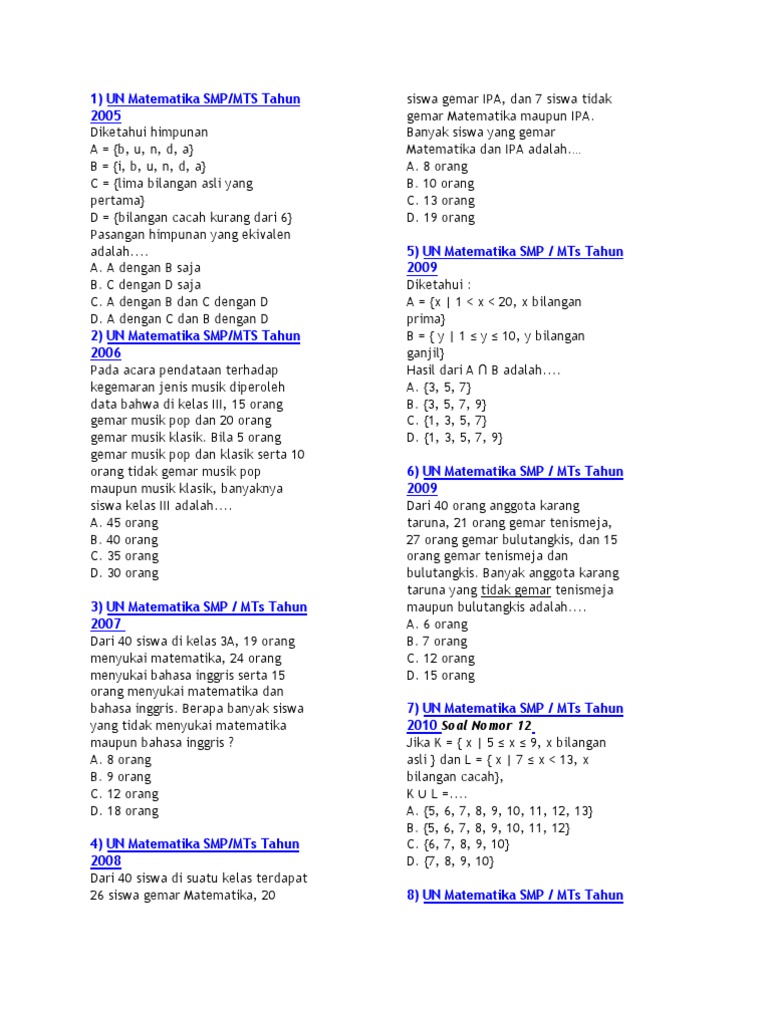 Ada beberapa catatan soal unbk matematika untuk smp dan soal simulasi. Jumpa lagi dengan mgmpmat, kali imi kami mencoba share beberapa paket latihan soal un matematika sebagai penelaahan kisi kisi un tahun 2019, yang dapat digunakan sebagai persiapan menghadapi un 2019. Download soal un matematika smp 2017 paket 4. Tidak ada hasil terbaik yang didapatkan dengan cara instant,. Soal un (unbk/usbn) ini bisa anda gunaka sebagai referensi dalam belajar untuk mempersiapkan diri dalam menghadapi ujian nasional (unbk/usbn) tahun pelajaran 2019/2020. Saat ini kita coba simulasikan ujian sekolah bentuk ujian tertulis. Soal latihan kekongruenan dan kesebangunan. Pada pelaksanaannya terdapat dua model, yaitu ujian nasional berbasis kertas dan ujian nasional berbasis komputer (unbk). Soal un matematika smp/mts 2019. Pembahasan soal un matematika smp tahun ajaran 2010/2011 paket 12 tim pembahas : 150 soal latihan usbn matematika sd. Latihan soal un smp/mts mata pelajaran : Nih, kita kasih latihan soal un matematika buat kamu kerjain sambil menikmati suasana tempat baru yang lebih segar, yang.